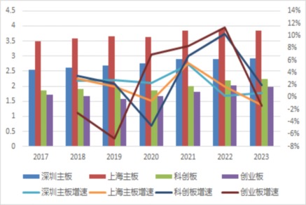 图3:策略性新兴产业TFP增速三、“两创”板块对新质坐蓐力发展的促进作用突显,头部公司成为发展新质坐蓐力的领头羊。一是与主板比,“两创”板块上市公司全要素坐蓐率“发轫低,增长快”。科创板坚抓“硬科技”定位,创业板服务成长型创新创业企业。2017—2023年,科创板上市公司加权平均TFP增长了20.96%,创业板增长了15.55%。沪、深主板阛阓分歧增长了10.34%和14.62%。在经济高速增长和增速放缓阶段,两创板块的TFP变化幅度比较主板阛阓更大。2018—2023年,科创板和创业板TFP加权平均增长率的波动率分歧为4.56%和6.52%,沪、深主板分歧为2.28%和1.65%。二是头部企业全要素坐蓐率增速更高。2018—2023年,上证50因素股全要素坐蓐率平均每年增长2.24%,高于上证A股平均值0.72个百分点;科创50因素股TFP产出率高于科创板平均值37.40个百分点。头部企业对板块、产业链和全阛阓栽种新质坐蓐力起到引颈和带当作用。