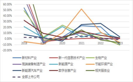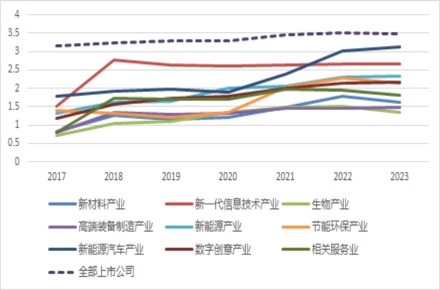 TFPTFP增速研发进入最高组2.921.81中高组4.513.34中间组6.924.14中低组10.114.55最低组22.035.51二、新兴产业和新期间运用鼓动新质坐蓐力较快发展。由于处在比较早期的发展阶段,新兴产业和期间跨越较快行业的上市公司多半规模较小但发展较快,相应地,全要素坐蓐率水平较低,增速较高。一是策略性新兴产业上市公司全要素坐蓐率低于沿路A股平均值,增速高于沿路A股平均值。2018—2021年,沿路策略性新兴产业TFP平均增速为17.60%,远超上市公司TFP平均增速2.37%。2022—2023年,一部分策略性新兴产业保抓了较高的TFP增速,清楚其发展后劲更大。连年来,新一代信息期间产业、新动力汽车产业和新动力产业发展飞速,2017—2023年中上述三类上市公司TFP平均值最高。二是期间跨越较快、新期间运用较多的行业全要素坐蓐率增速较高。跟着期间跨越,在新期间运用的赋能下,新动力汽车产业、新材料产业和节能环保等行业全要素坐蓐率加速增长,增速高于沿路A股平均值。